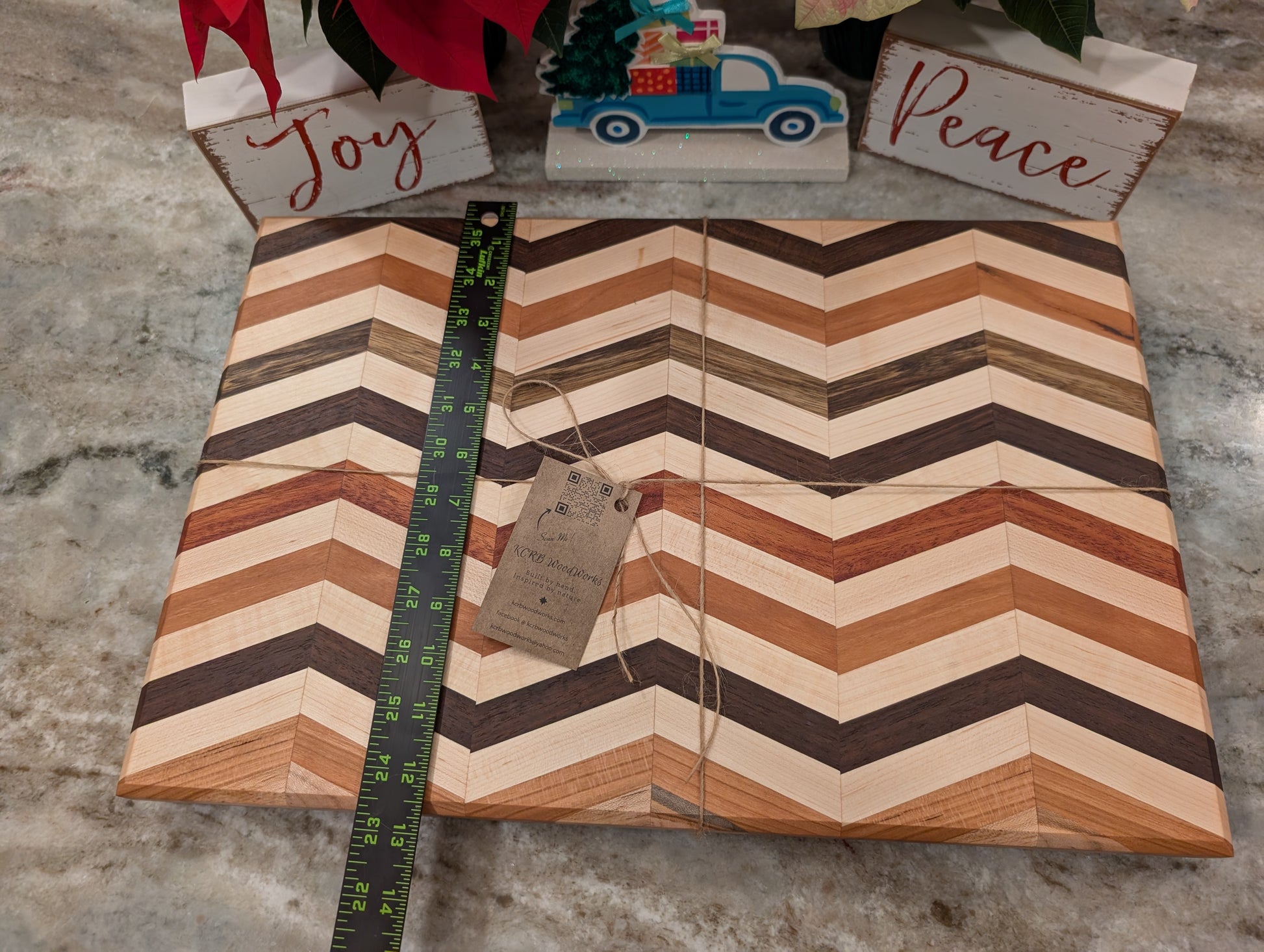 This handcrafted cutting board brings both color and character to your kitchen. Each hardwood is carefully selected, joined, and finished by hand to create a durable, functional piece of art you’ll enjoy for years to come.